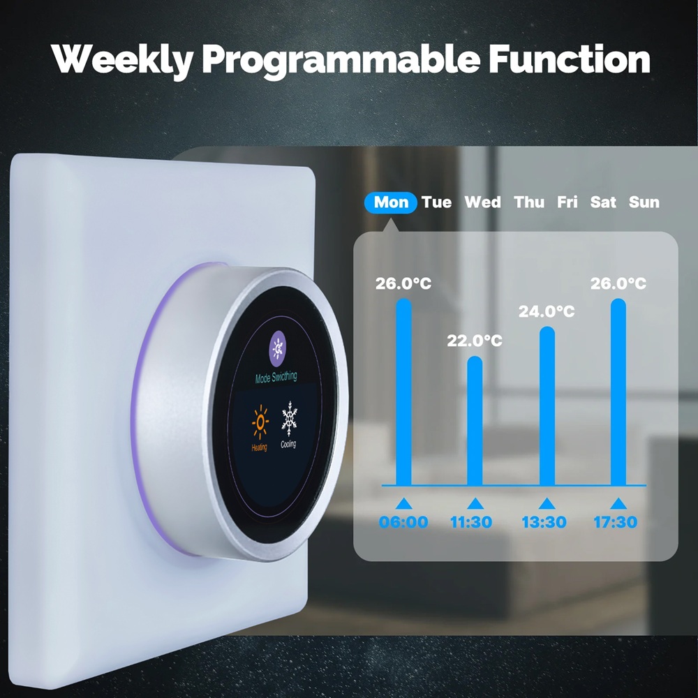 Energy-saving with intelligent temperature control: Save on energy bills by easily adjusting the temperature using the intelligent temperature control feature of this WiFi thermostat with a rotary knob.